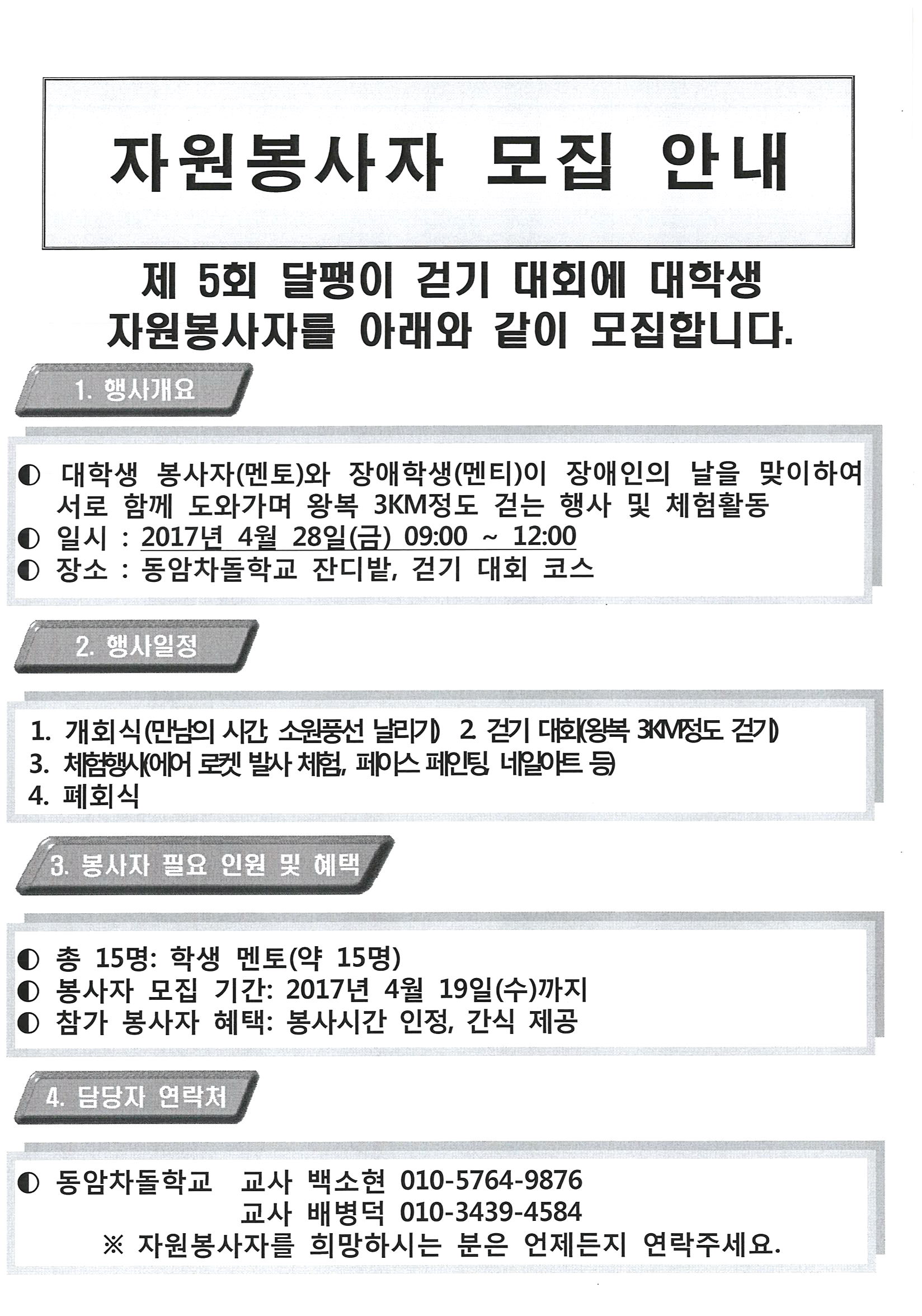 | 7 | 제 5회 달팽이 걷기 대회 대학생 자원봉사자 모집 | 장애학생지원센터 | 17-04-08 | 412 |