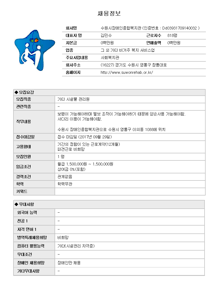 | 15 | [수원시장애인종합복지관] 채용 | 장애학생지원센터 | 17-09-14 | 299 |